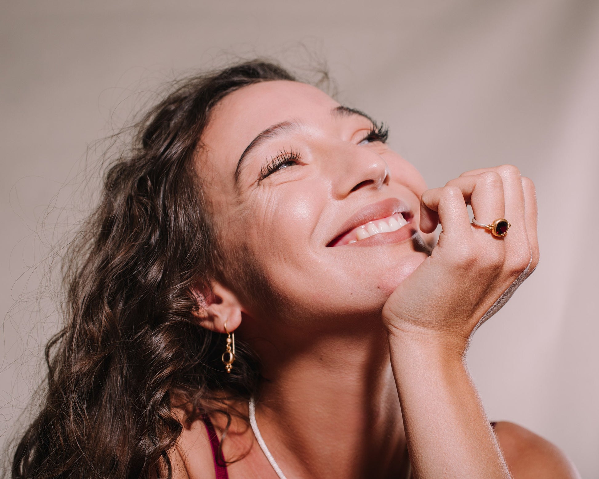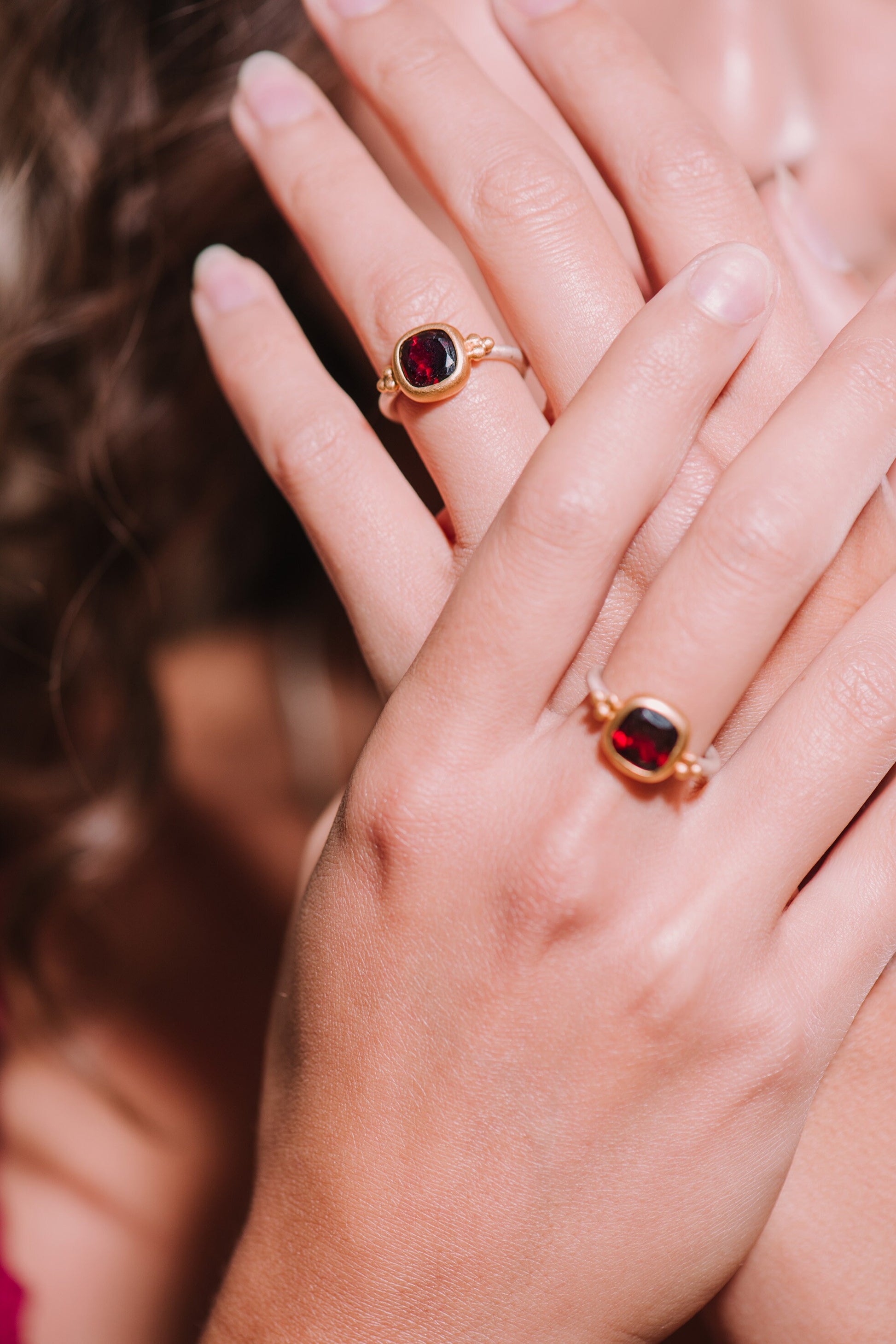 Unser facettierter Granatring ist Teil eines Sets, das auch Ohrringe, Ohrstecker und einen Anhänger umfasst. Alle diese wunderbaren Schmuckstücke sind in unserem Etsy-Shop erhältlich, sodass Sie ein harmonisches Ensemble kreieren können.