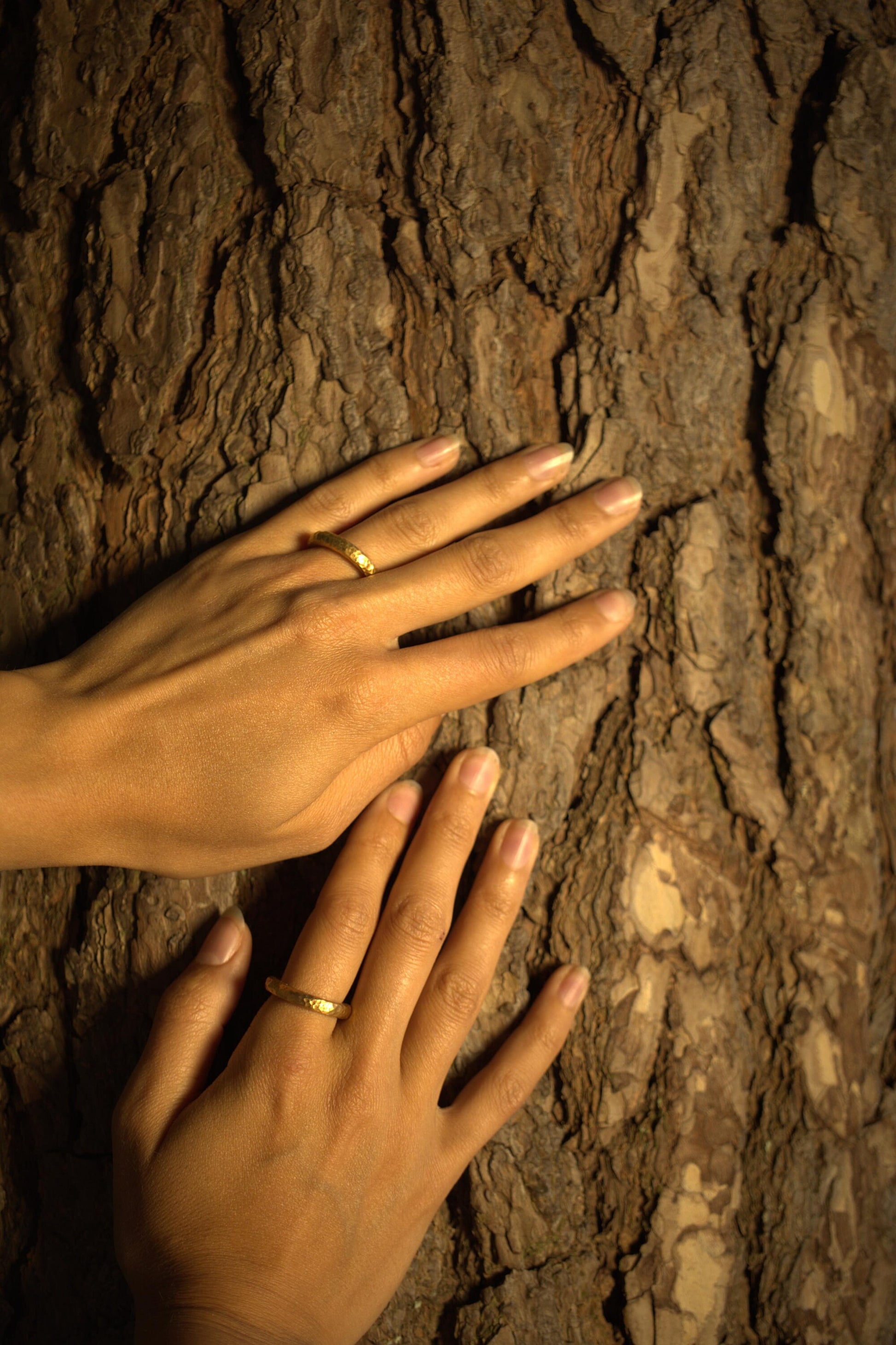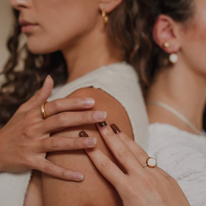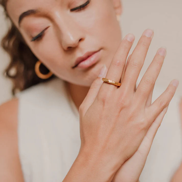 Der 3mm dicke Ring ist aus massivem Messing gehämmert und wurden in einem galvanischen Goldbad mit einer 4µ dicken Schicht Gold überzogen, die besonders lange hält. Monika hat sich bewusst für Messing als Grundmaterial entschieden, damit die Kreolen in einem satten Sonnengold erstrahlen. Durch die gehämmerte Oberflächenstruktur, welche an die liebevoll an die Herkunft der Schmuckstücke erinnert, reflektiert das Licht besonders gut, was es zu einem perfekten Begleiter für sonnige Sommertage macht.