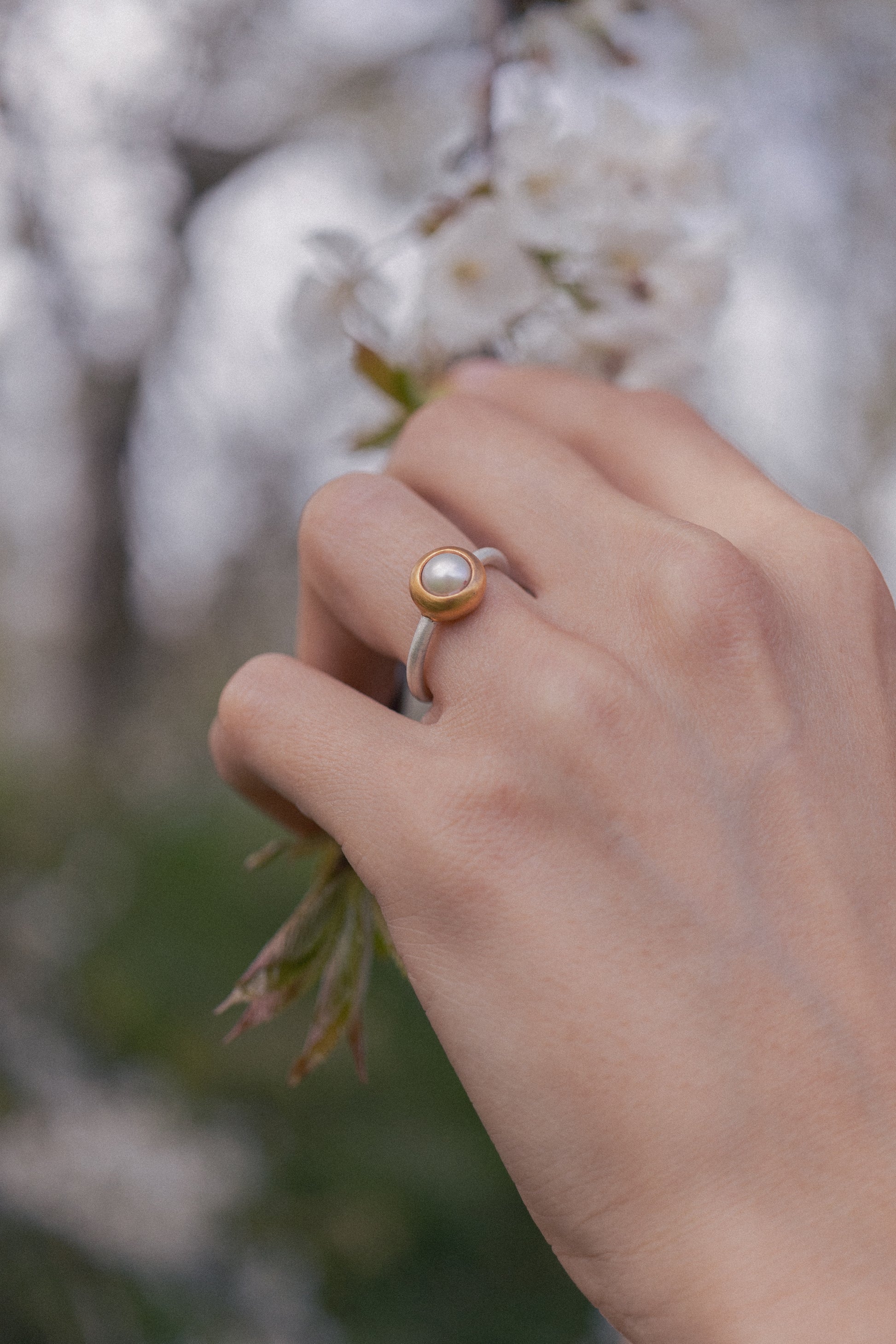 Die filigrane Ringschiene legt sich geschmeidig um den Finger und ist präzise in die matt vergoldete Fassung eingearbeitet. Monika Herrés kennzeichnende Kombination aus Silber und Gold lässt den sanften Glanz der natürlichen Salzwasserperle besonders hervorstechen. Der Ring ist ein elegantes und schlichtes Schmuckstück, wodurch er sich wunderbar mit unterschiedlichen Looks kombinieren lässt und beliebig mit den weiteren Modellen der Pearl Classics kombiniert werden kann.