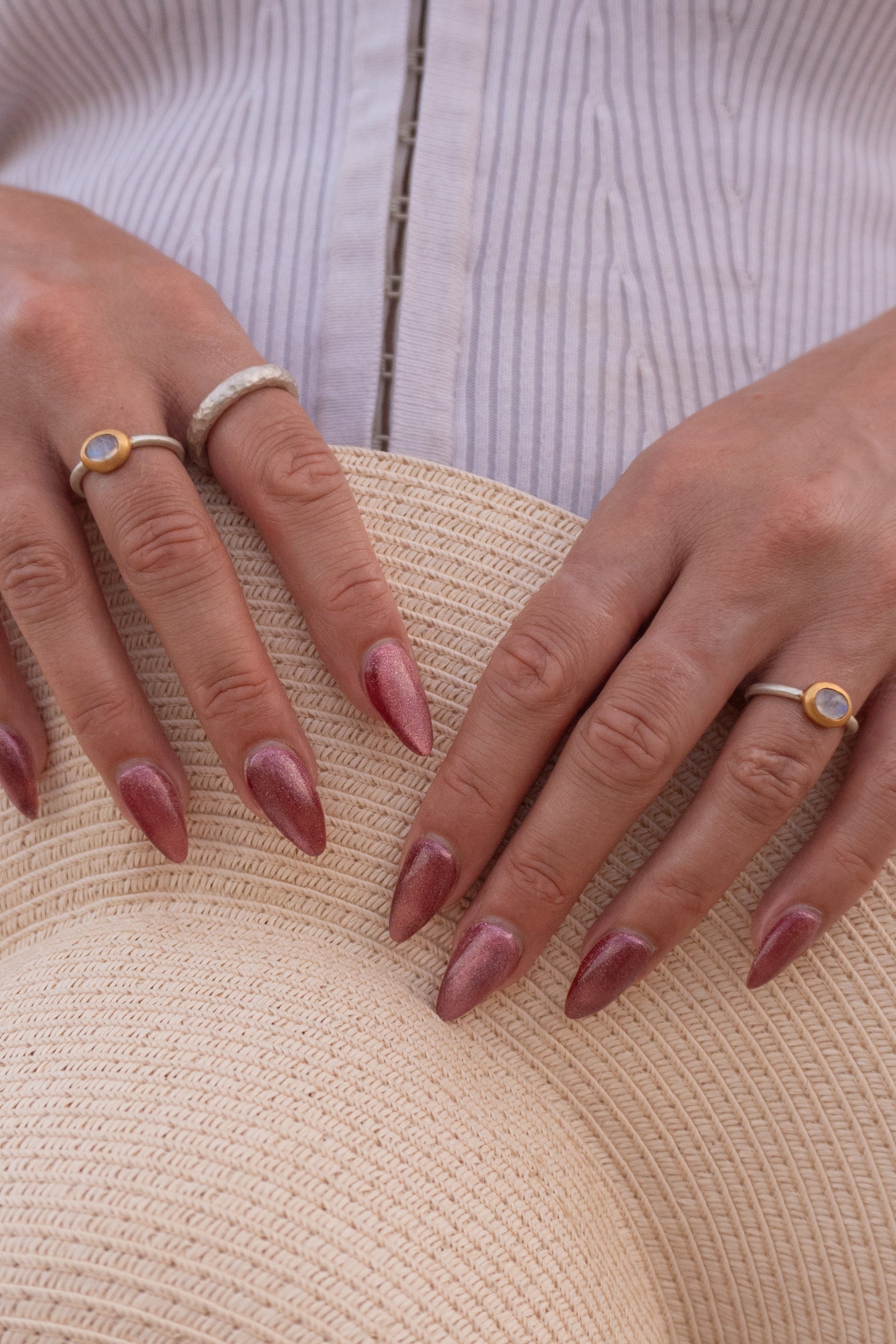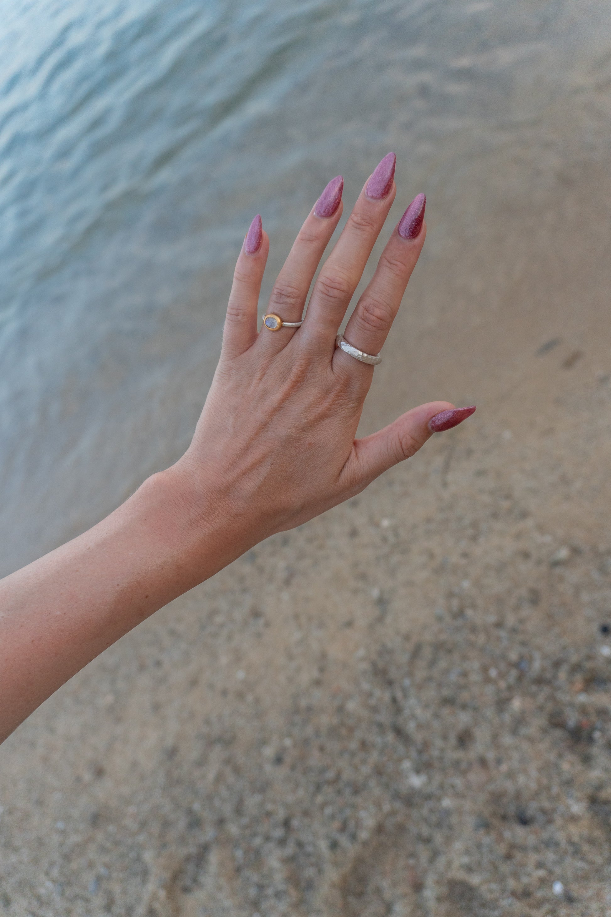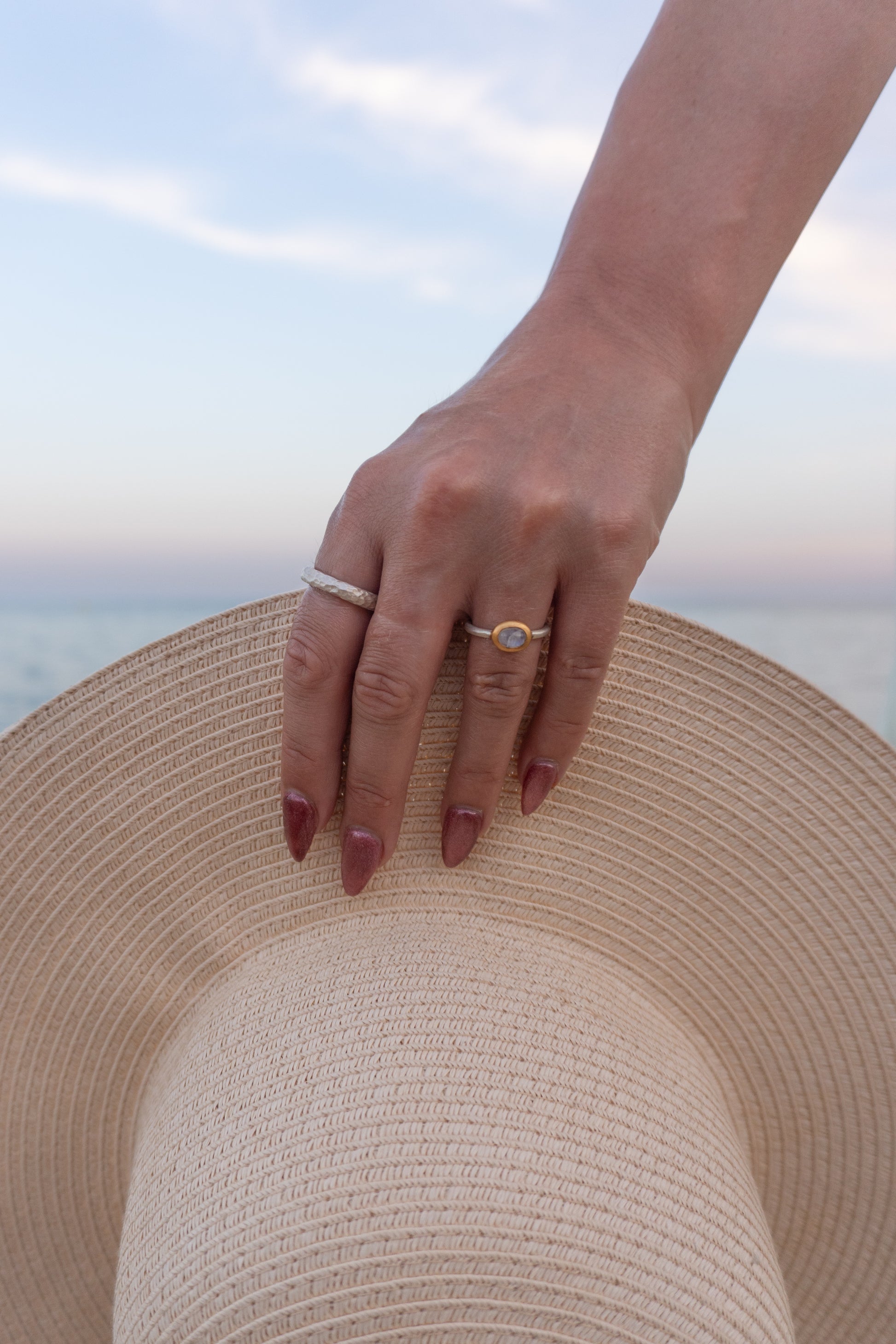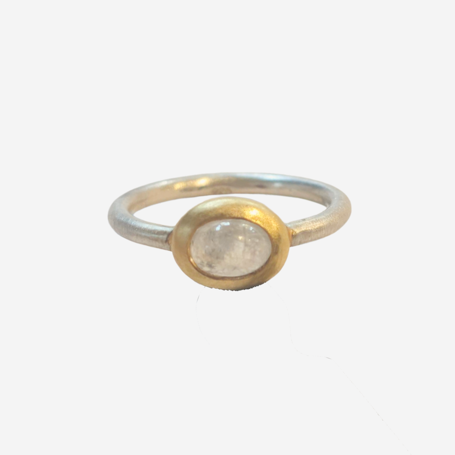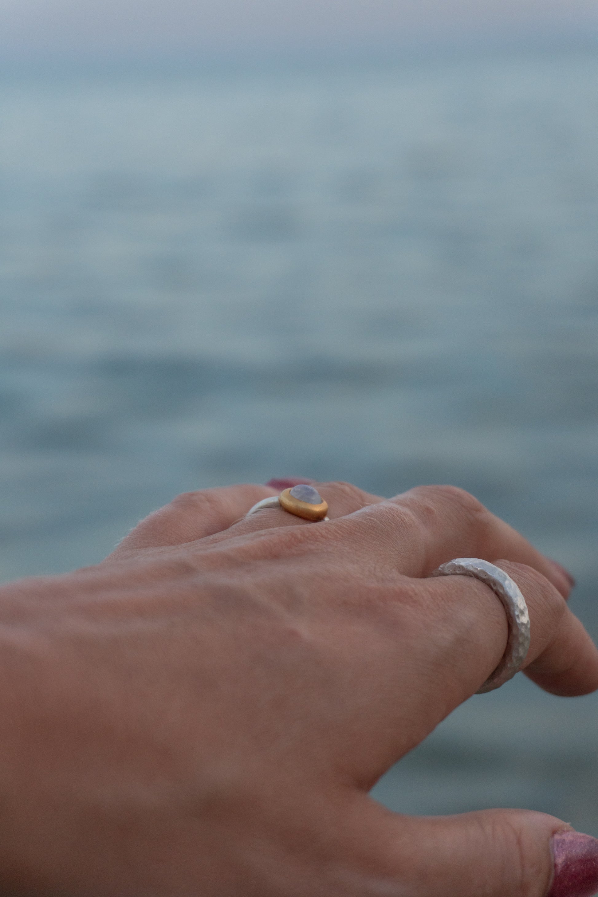 Dieser zierliche Ring ist die kleine Schwester unseres klassischen Mondsteinrings – handgefertigt aus Sterling Silber, mit einer matt vergoldeten Fassung, die den sanften Schimmer des Edelsteins einfängt.