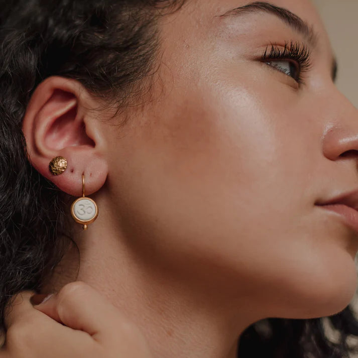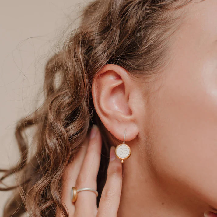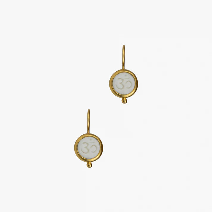 Monika Herré praktiziert und unterrichtet nun seit 15 Jahren Yoga und will ihrer Leidenschaft mit dieser Kollektion Ausdruck verleihen. Die vergoldeten Ohrhänger aus Sterlingsilber tragen das Ohm Symbol in Porzellan geprägt. Das Ohm Symbol stammt aus dem Sanskrit und verbildlicht den ursprünglichen Laut des Universums, der alles in sich hält. Es steht für die Einheit von allem.