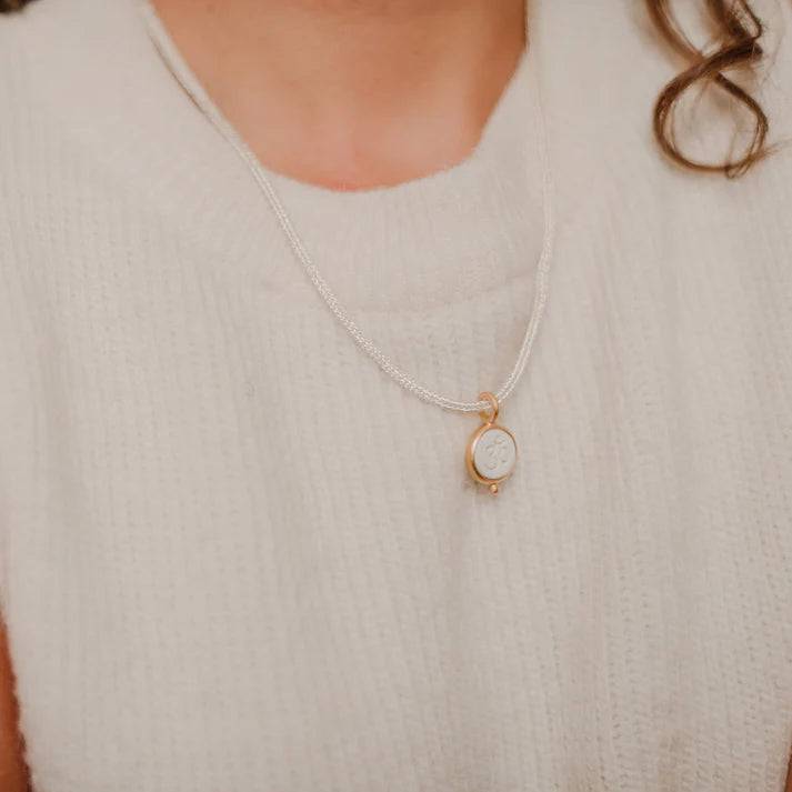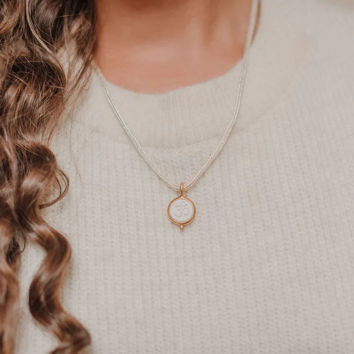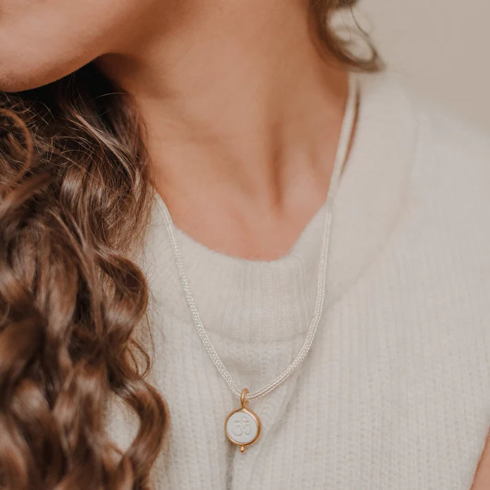 Monika Herré praktiziert und unterrichtet nun seit 15 Jahren Yoga und will ihrer Leidenschaft mit dieser Kollektion Ausdruck verleihen. Der vergoldete Anhänger aus Sterlingsilber trägt das Ohm symbol in Porzellan geprägt. Das Ohm Symbol stammt aus dem Sanskrit und verbildlicht den ursprünglichen Laut des Universums, der alles in sich hält. Es steht für die Einheit von allem. Die harmonische Verbindung aus verspielten Details und klassischem Design zieht sich als roter Faden durch die gesamte Kollektion.