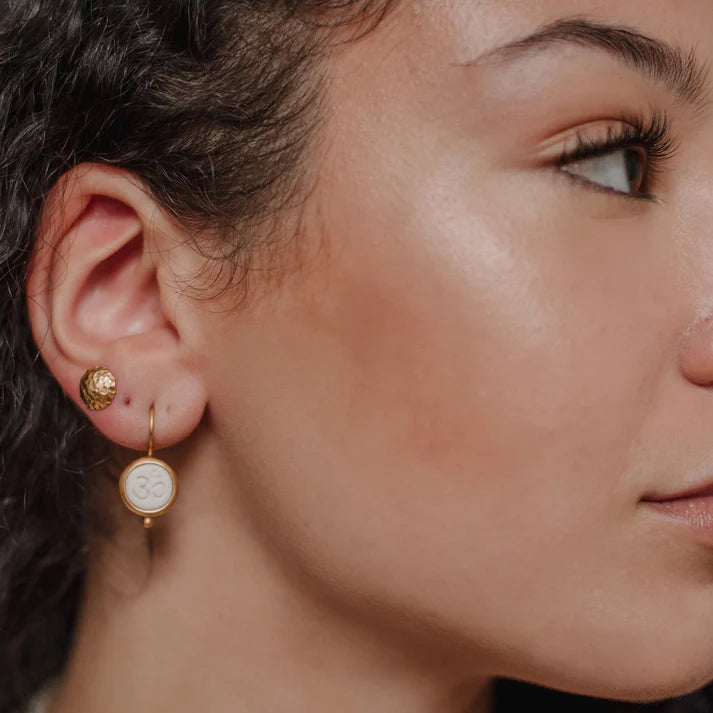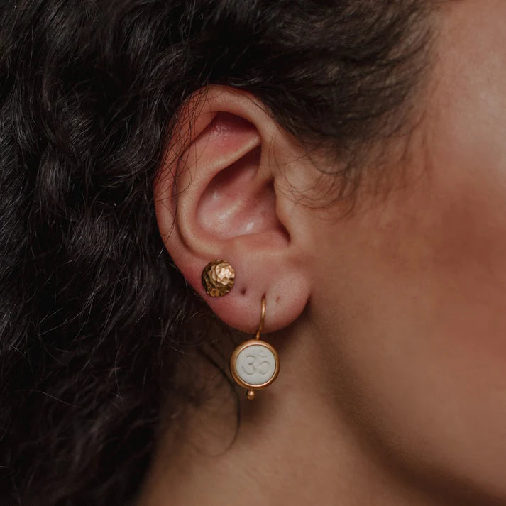 Die kreisrunden Ohrstecker messen einen Durchmesser von 9mm und sind somit ein gut sehbares Statement Stück direkt am Ohr. Sie sind wie die meisten Designs von Monika Herré aus massivem 925er Sterling Silber gehämmert und wurden in einem galvanischen Goldbad mit einer 4µ dicken Schicht Gold überzogen, die besonders lange hält. Durch die gehämmerte Oberflächenstruktur, welche an die liebevoll an die Herkunft der Schmuckstücke erinnert, reflektiert das Licht besonders gut, was es zu einem perfekten Begleiter für sonnige Sommertage macht.
