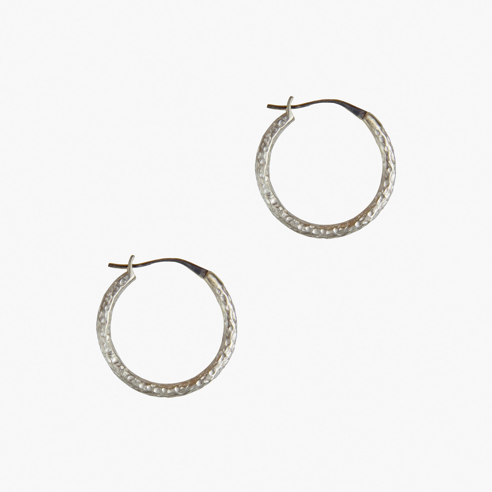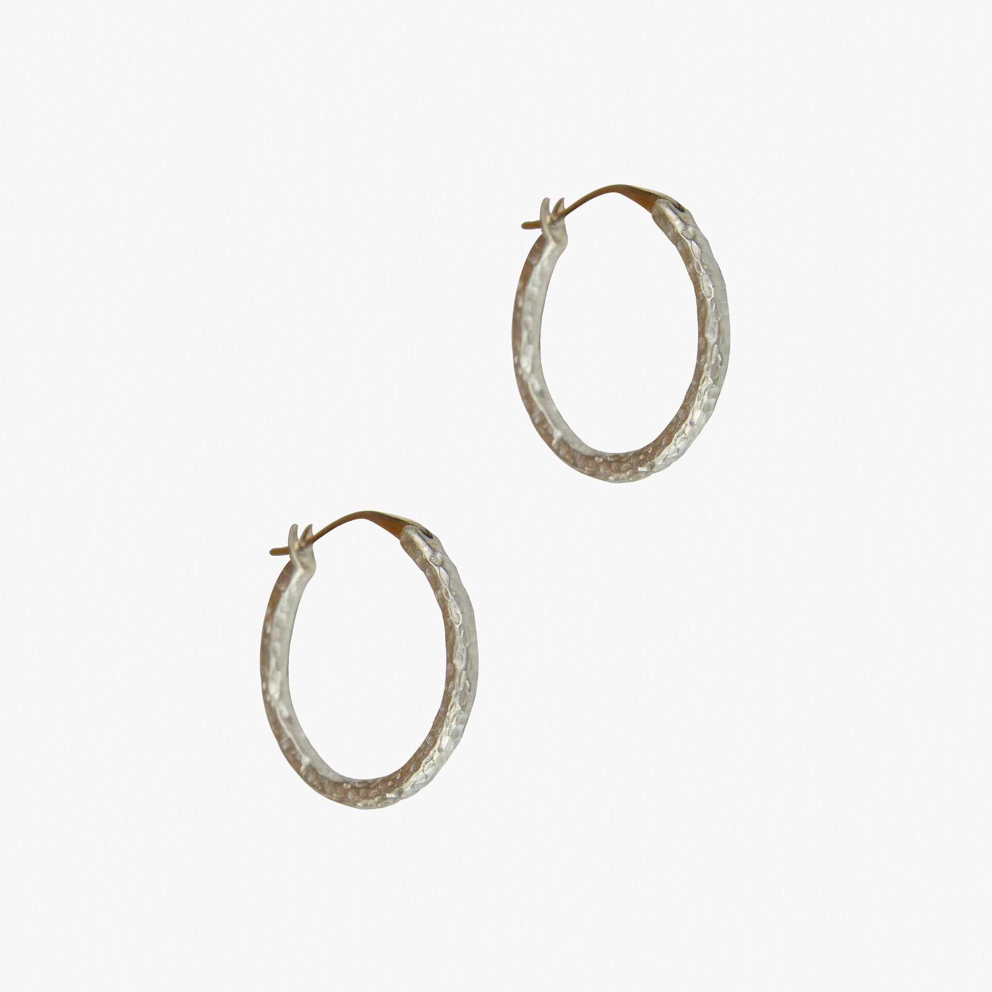 Die Kreolen sind aus massiven 925er Sterling Silber gehämmert und messen einen Durchmesser von 3cm mit einer Dicke von 3mm. Für den extra weißen Glanz wurden sie mit einer weiteren Schicht in 975er Sterling Silber überzogen. Durch die gehämmerte Oberflächenstruktur, welche an die liebevoll an die Herkunft der Schmuckstücke erinnert, reflektiert das Licht besonders gut, was es zu einem perfekten Begleiter für sonnige Sommertage macht.